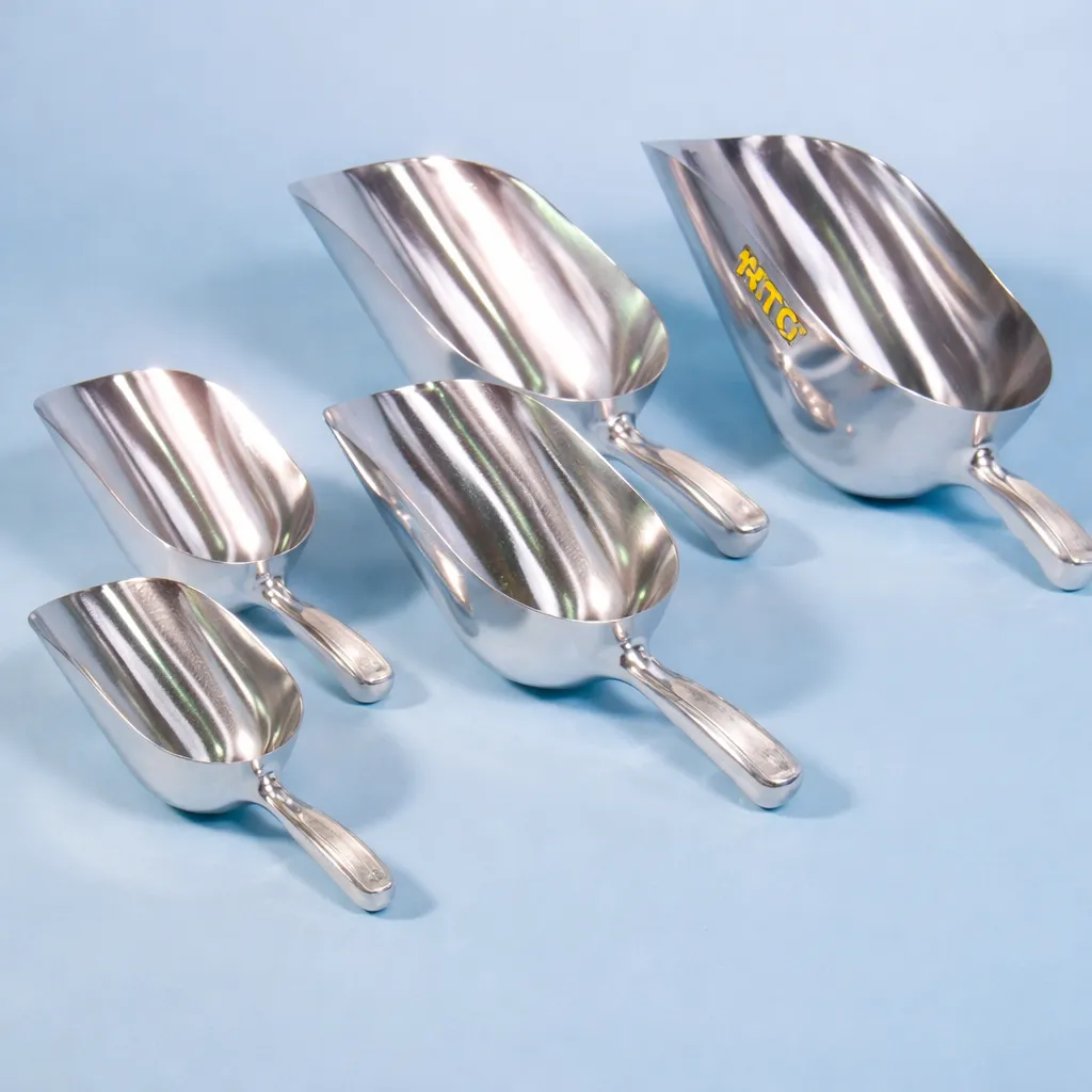 Stainless steel scoops are commonly used because they are strong, reusable, and resistant to corrosion.